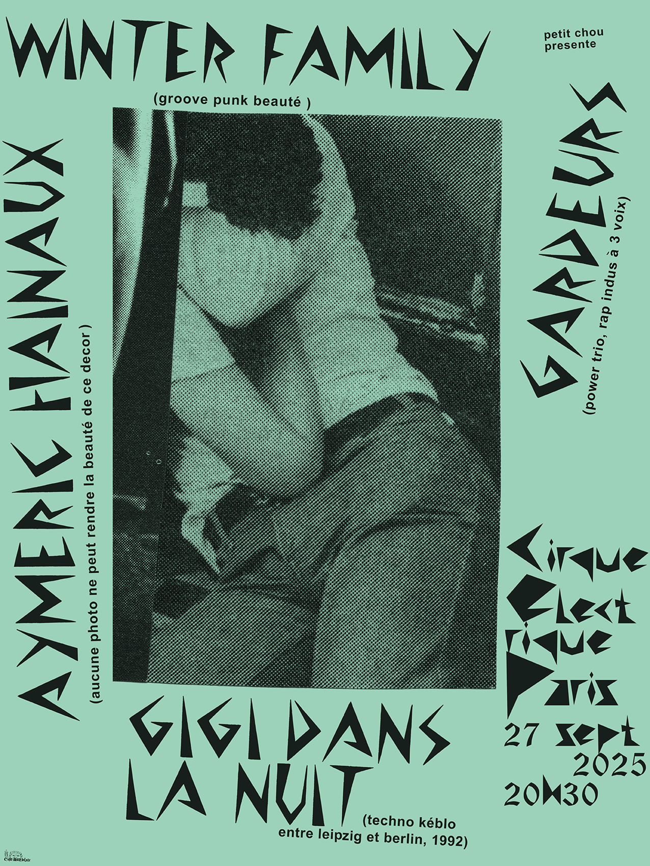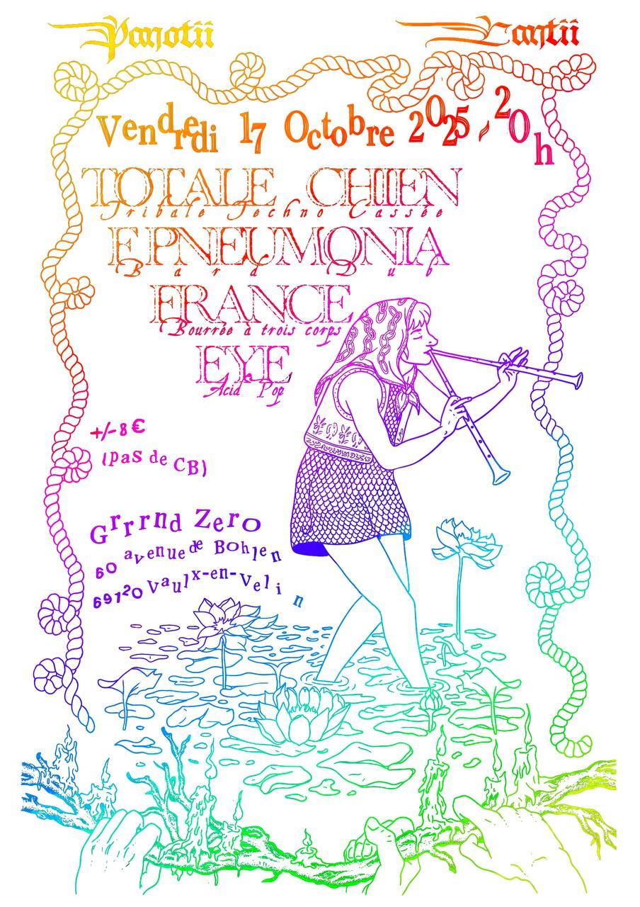 🐦⬛ F.Pneumonia (Barde Dub / Paris ~ Strasbourg)Avec Machicoulis, son premier album, F.Pneumonia nous emmène avec lui à travers sentiers de terre. Petrichor, odeurs herbacées et veloutes mystiques nous accompagnent durant cette escapade aux sonorités résolument dub ECOUTER - https://carpacciocathedrale.bandcamp.com/album/f-pneumonia-machicoulis-cc017 🕯️ EYE (Balades mécanique / Brest) La route continue sur les douces sonorités des boîtes à rythme et synthétiseurs de EYE. Riche de plusieurs sorties sur le label Knekelhuis, EYE nous offrira une pop acidulée, tel un mélancolique conte coloré où chaque morceaux serait une page ECOUTER - https://knekelhuis.bandcamp.com/album/honolulu-saigon VOIR - https://www.youtube.com/watch?v=8A1S2m3tsAc 🌖 France (Bourrée à trois corps / Haute-Loire) France est un trio : vielle à roue, batterie et basse qui nous entraîne dans un bal sombre depuis maintenant plus de 20 ans. Leur musique est tantôt hypnotique presque nuageuse, tantôt agressive et détourne les codes des musiques dites « traditionnelles ». France s'empare de la vielle à roue et nous ouvre les portes d'un monde cosmique pour une pause à l'intérieur de soi. Une note unique, des rythmes minimalistes pour un drone de l'infini, rejoignez la bourrée à trois corps ECOUTER - https://standard-in-fi.bandcamp.com/album/destino-scifosi VOIR - https://youtu.be/1smHVI1vLj0 ⛈️ Totale Chien (Tribal Techno Cassé / Marseille) Rythmes syncopés et décibels se fracassant contre les murs, Totale Chien fait des étincelles avec ses machines. La garantie d'une fin de voyage électrique riche en kick distordu ECOUTER - https://soundcloud.com/totale-chien 💫💫💫 20H – 01H Grrrnd Zero 60 avenue de Bohlen, Vaulx-en-Velin Métro A jusqu’à 1H40 +/- 8 euros, no CB, no relou affiche par Tendresse Totale Adress: Grrrnd Zero60 Avenue de Bohlen 69120 Vaulx-en-Velin Vaulx-en-Velin ![]() |