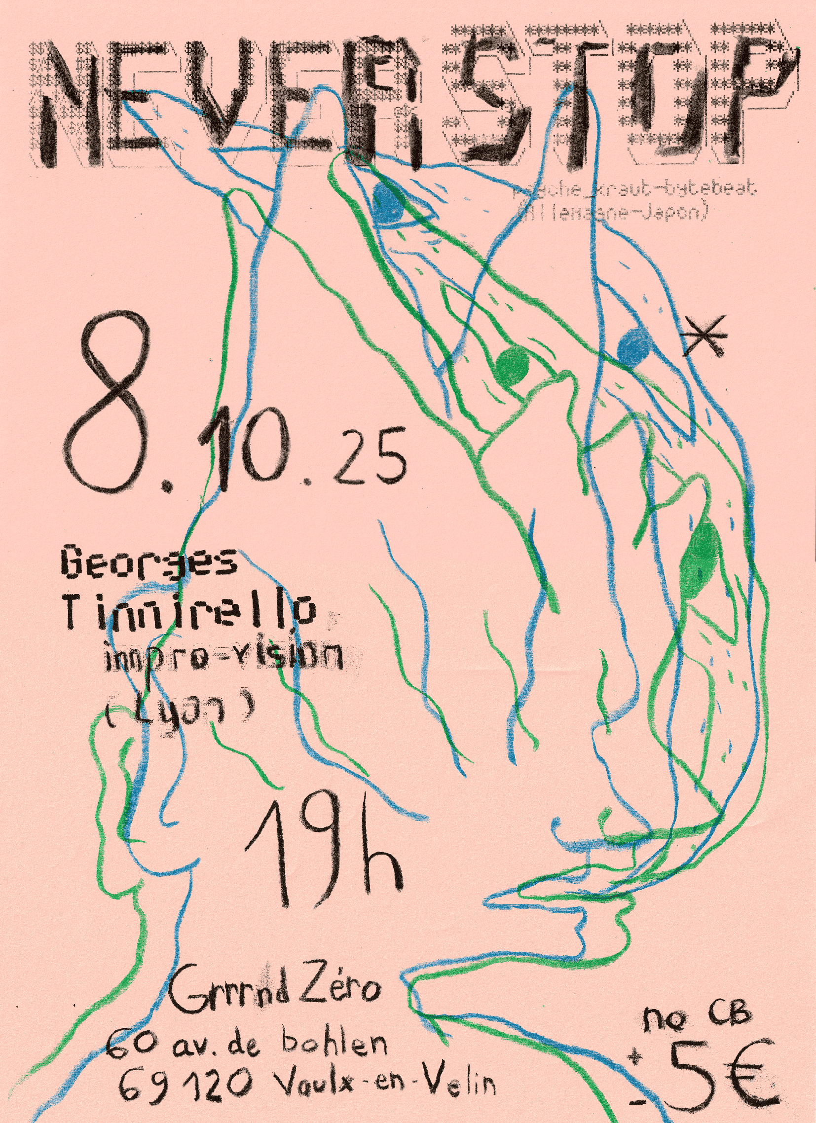 Kaitlin Simotics (Atlanta) _ post-digital music https://relaxinrecords.bandcamp.com/album/kaitlin-music Elastic Systems (Nantes) _ kraut sunnity https://www.ursss.com/2024/02/elastic-systems/ Benjamin Moutte (Rennes) _ pop-chiptune https://www.youtube.com/watch?v=c_erC9LWHuA Adress: Grrrnd Zero60 av. de Bohlen 69120 Vaulx-en-Velin Vaulx-en-Velin |