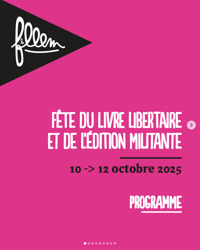 ▶ La Fête du Livre Libertaire et de l'Édition Militante 2025 - Programme📅 Vendredi 10 octobre - 19h / 22h 19h : Ouverture des portes 20h : Concert Chocolat Billy (free rock enjoué et dansant - Bdx/Marcillac) et Meddor (yéyé émotionnel - Bdx) - 5€ 📅 Samedi 11 octobre - 14h / 20h 14h : Ouverture des portes 15h : Présentation de l’ouvrage Apocalypse nerds 17h : Présentation de l’ouvrage Nous sommes le cri d’un peuple 18h30 : Projection du film Pour l’honneur de Gaza 📅 Dimanche 12 octobre - 10h / 18h 10h : Ouverture des portes 10h/13h : Jeux de société avec Yeast games 14h : Présentation de l’ouvrage Maghreb noir 15h30 : Carte blanche aux éditions Cases Rebelles 18h : Fermeture des portes ▶ Les stands Les maisons d’éditions et revues qui seront présentes : @casesrebelles , Éditions Asymétrie, @editionslesetaques , @editionsicibas, @maisondeseditions, @rotbokrik, @tendancenegative, @yeastgames Adress: Athénéé Libertaire7 rue du Muguet Bordeaux ![]() |
