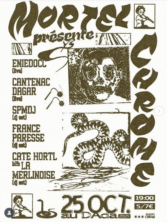 Samedi 25.10.25 - @dada.toulouseMORTEL CHROME #8 💥@eniedocc / Live Ambient, électronique expérimentale, noise nostalgique eniedocc compose des musiques brutales et emo dont la matière est glanée dans le réel puis tordue, épuisée. Ses boucles sonores déchirées et recousues, mêlent ambient, électronique expérimentale, voix nostalgique et noise. Ballades viscérales, plongées froides aux sonorités texturées et lancinantes, et sa voix, reliant l’intime et le brut, comme un <3 gravé sur un arbre, avec un bout de métal et un peu d’espoir. https://soundcloud.com/eniedocc 💥Cantenac Dagar - @isolarecords / Live Folk, indus, banjo/beatbox Cantenac Dagar c'est Stéphane Barascud et Aymeric Hainaux. Cantenac Dagar contient le passé, le présent et l'avenir. Punks d'un autre temps en quête de beauté, ils sont réunis autour d'un acte musical au bord de la performance : une boucle et un banjo pour une musique brute et criarde sans début ni fin. Trance radicale, hypnose organique. https://www.cantenacdagar.com/ 💥SPMDJ - @louise_bghs / DJ set Deconstructed club, sons en tout genre Puisant dans les souvenirs des murs tagués du périph' parisien autant que dans les éclats cristallins des ruisseaux d'Ardèche, SPMDJ est gémeaux, tendue entre les contraires, témoin de l’harmonie qui émerge (peut-être?) du chaos. Atmosphères poussiéreuses, infrabasses qui grondent, rap, chansons naïves bricolées jusqu'au funk électronique de Detroit : c'est dans l'hybride que certaines choses semblent prendre toute leur force. https://soundcloud.com/syndrome_premenstruel_spm MORTEL CHROME DJ sets : @franceparesse : gros digger soulseek, mix aux sonorités électroniques passant du krautrock au post punk, au dub à l'expérimental... @cate.hortl B2B La Merlinoise - @aanneyiing : from electronic to leftfield, darkwave to giallo, ambient to industrial, from blabla to blablabla https://soundcloud.com/catehortl/sets/podcasts https://soundcloud.com/lamerlinoise Artwork : @franceparesse Crédits photos : Eniedocc : Naïa Combary SPMDJ : Talita Otovic ☞ Samedi 25-10-2025 ☞ 19h00 -2h30 ☞ 27 avenue Honoré Serres, 31000 Toulouse ☞ Métro Compans-Caffarelli ☞ Prix : 5-7€ / NO CB, CASH ONLY Adress: DADA27 avenue Honoré Serres Toulouse ![]() |