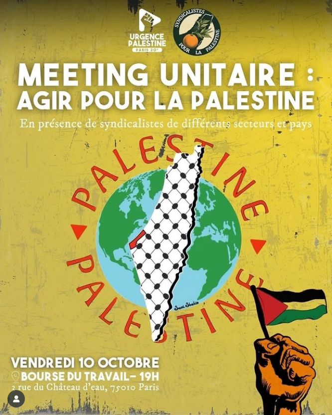 📢 Vendredi 10 octobre📍 Bourse du travail – 29 boulevard du Château d’Eau, Paris 10e 🕕 18h00 📌 Réunion d’organisation : s’unir sur nos lieux de travail en tant que travailleurs et travailleuses pour la Palestine ✊ Organisée par @Syndicalistes pour la Palestine Adress: Bourse du travail2 rue du Chateau d'eau Paris ![]() |