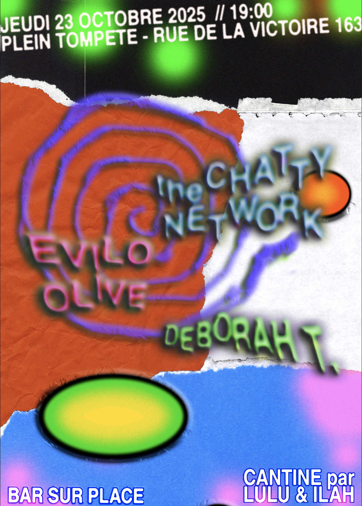 𓇗 cooooncerts 𓇗✧ The chatty network (jeu vidéo dans lequel une galerie de personnages flânent et bavardent. C'est l'occasion de rencontrer Bergur dans sa cave,Steve Bonnet avant qu'il soit banni, les plaintes de Framboize Abruzzo ) ✧ Deborah T ✧ Evilo Olive ( soupe accidentelle de tous les sons du siècle actuel ) ✧ CANTINE de ila et lulu 🍴 ♧ Merci à Alix pour la merveille affiche ci-dessous INFOS : 163 RUE DE LA VICTOIRE 23 OCTOBRE A 19:00 𓇗 à bientôxxxx 𓇗 Contact: coucou@pleintompete.org![]() |