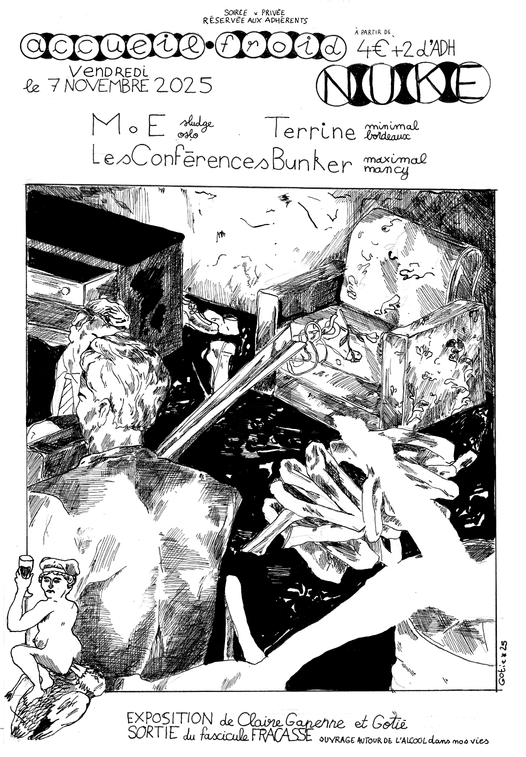 07.11.2025 | 20:30 | Amiens | MoE + Terrine + Les Conférences Bunker + Expo Claire Gapenne & Gotié + Release du fascicule FracasseDiscription: