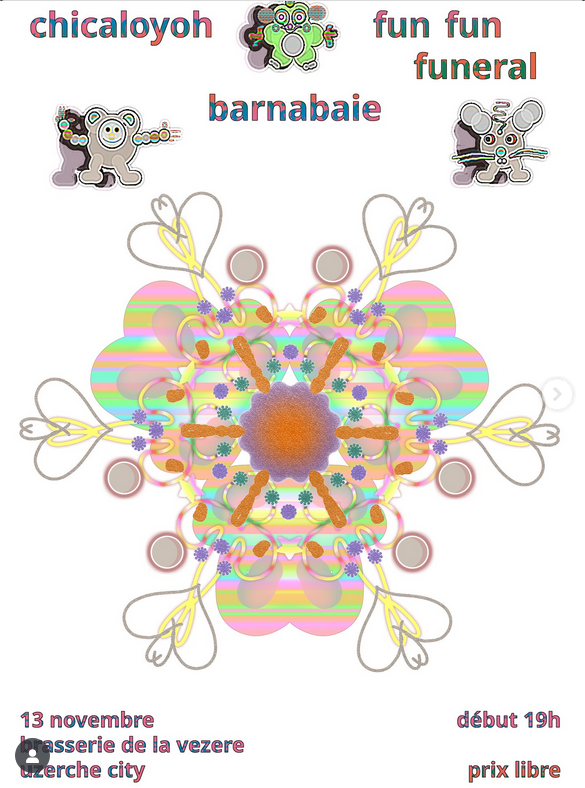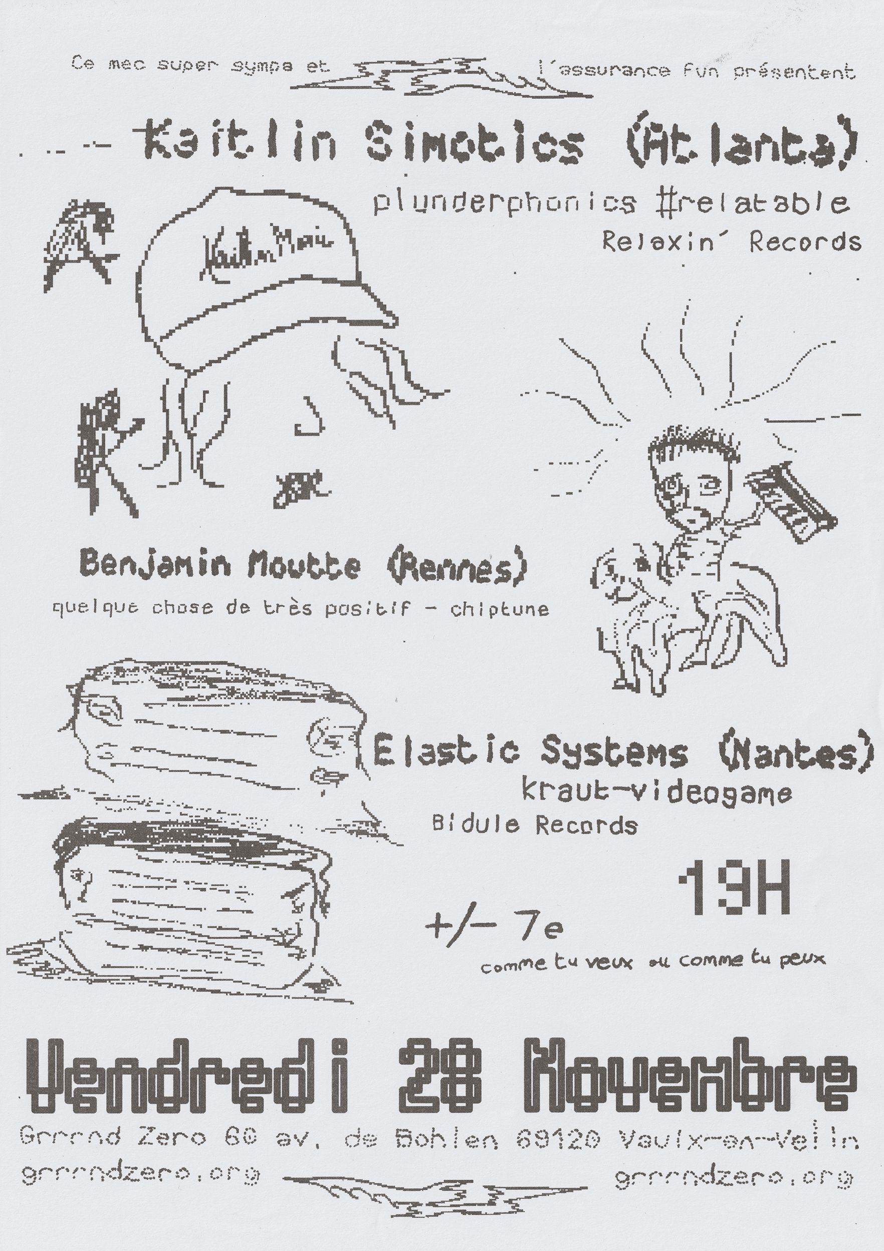 Vendredi 28 Novembre Ce mec super sympa et l'assurance fun présentent : Kaitlin Simotics (Atlanta) _ Relaxin' Records ___ plunderphonics #relatable Kaitlin Simotics agit par collages de samples, poétique de la synthèse vocale et effets. Parfois cela prend une forme de chanson pop, mais pas trop souvent. Une combinatoire de production expérimentale, de plunderphoniques et d'absurdisme lui permet de mettre en œuvre quelque chose à la fois fun, dérangeant d'ironie mais surtout qui se comprend bien à l'heure de l'entropie numérique générale. https://relaxinrecords.bandcamp.com/album/kaitlin-music Elastic Systems (Nantes) ____kraut-videogame Elastic Systems est le duo synergique d'Arnaud Aubry et de Thomas de Tutoriel qui partent d'idées simples pour faire jaillir une explosion soutenue de petits sons sinusoïdaux, MIDI ou de samples de jeux vidéos battus au rythme speedrunné d'une batterie électronique déterminée. L'euphorie cyborganique qui en résulte souvent stimule les circuits de récompense. https://youtu.be/nVIOM31ZVCI Benjamin Moutte (Rennes) ____quelque chose de très positif - chiptune Benjamin Moutte est tombé dans les synthétiseurs petit et en est ressorti de manière spectaculaire pour communiquer quelque chose de frénétique, un peu étrange et joyeux dont beaucoup de personnes qui étaient venu voir Kate NV la dernière fois gardent un souvenir tout sourire https://youtu.be/c_erC9LWHuA +/- 7euros Ouverture des portes à 19h Grrrnd Zero 60 av de bohlen 69120 Vaulx-en-Velin grrrndzero.org Adress: Grrrnd Zero60 av. de Bohlen 69120 Vaulx-en-Velin Vaulx-en-Velin ![]() |