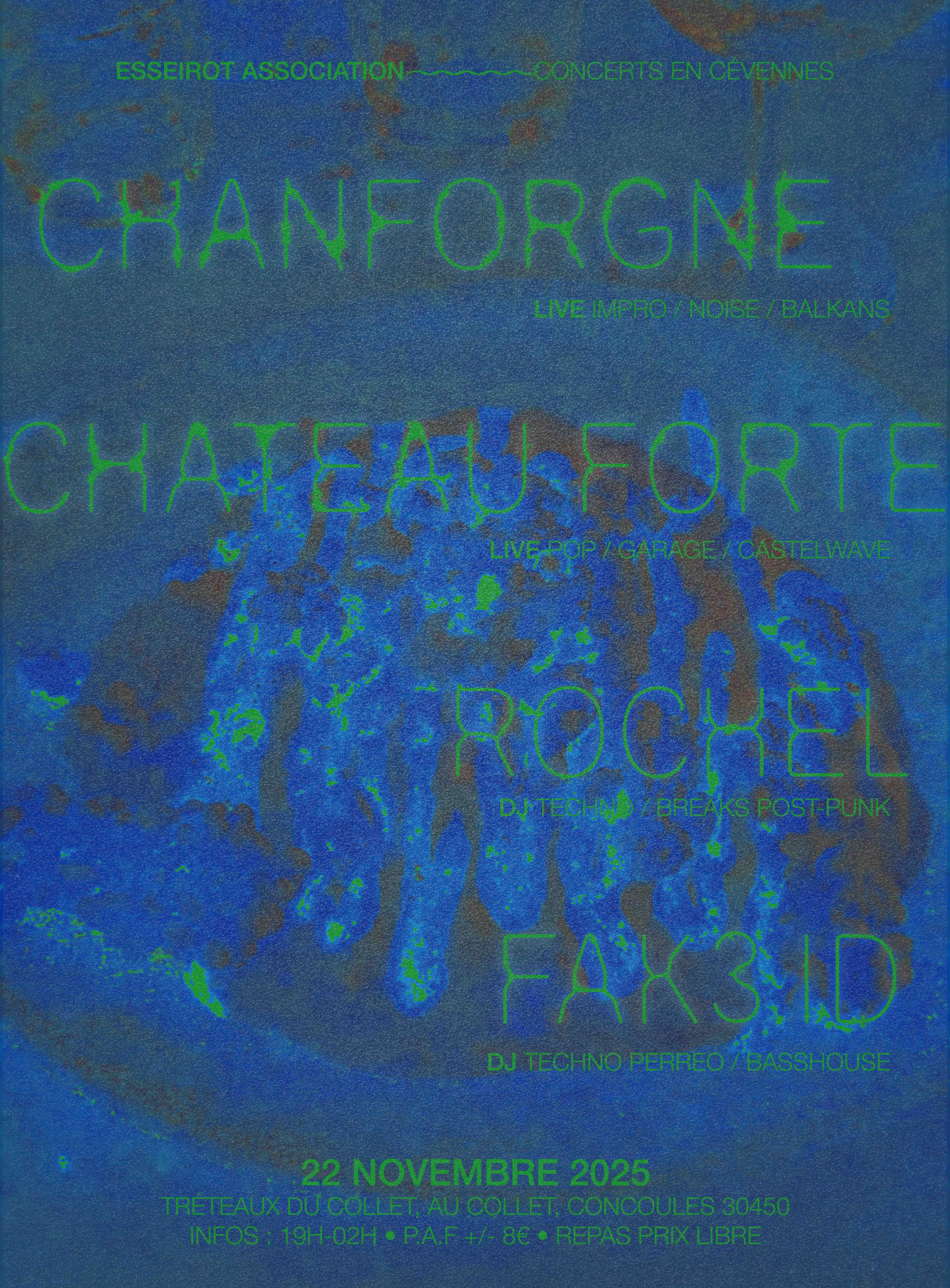 CONCERTS LIVES & DJ's // 22 NOVEMBRE // (LIVE) CHATEAU FORTE FR30 pop, garage, castelwave // (LIVE) CHANFORGNE FR42 impro, noise, balkan // (DJ) ROCHEL FR07 techno, breaks, post-punk // (DJ) FAK3.ID FR30 techno perreo, basshouse // 19h a 02h // 8e+ou- // Repas Prix Libre