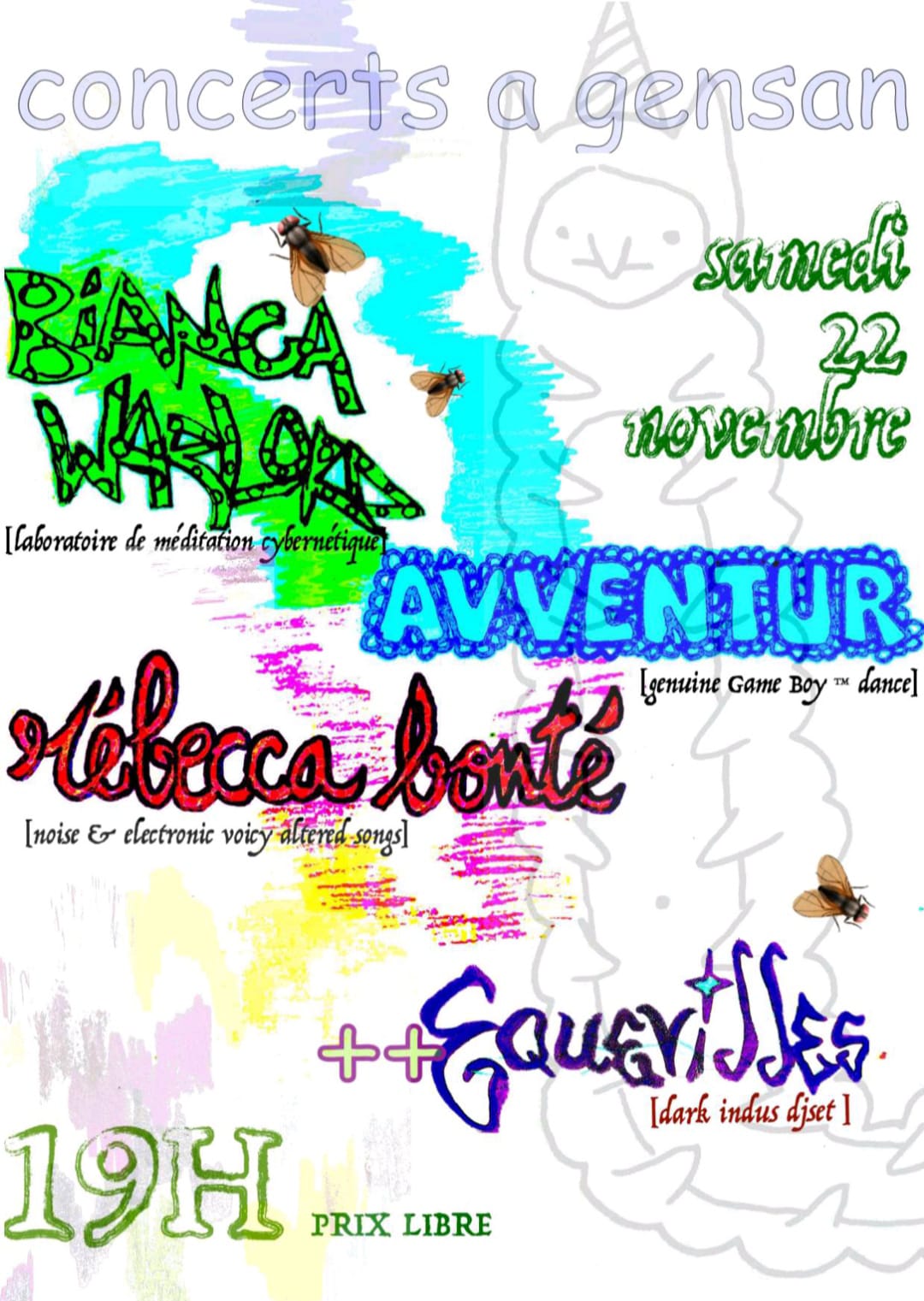 Entrée prix libre à partir de 15 euros, 20 euros conseillé, + si tu peux.Adhésion requise à prix libre à partir de 1 euros. Les entrées financent les trajets des artistes et les frais du lieu pour ces 2 jours, toute l équipe et les artistes sont bénévoles. Merci à toustes pour votre soutien !! PROGRAMATION CONCERTS : SOURDURENT OD BONGO COUDE EN SANG FEROMIL AYMERIC DE TAPOL ALEXANDRE CHANOINE CATHERINE DANGER 12V5 AETHER VARIA DARK MIMOSA J KAPLAN DEBORAH S HANDS ON SLOT MACHINE MC KER 6 DU SANG SUR LA COMMODE HELOISE FRANCESCONI LA BANDE A BADER NMT LEONARD KOTIK UNTEL MAT DECRYPT DJ LEEKID SPM PARASITE JAZZ QUEL ENFER! YEGA72 BIVOU4C B2B SEMIA TEP TOUT EST CASSE BAR FOOD FREE CAMPING NO DOGS |