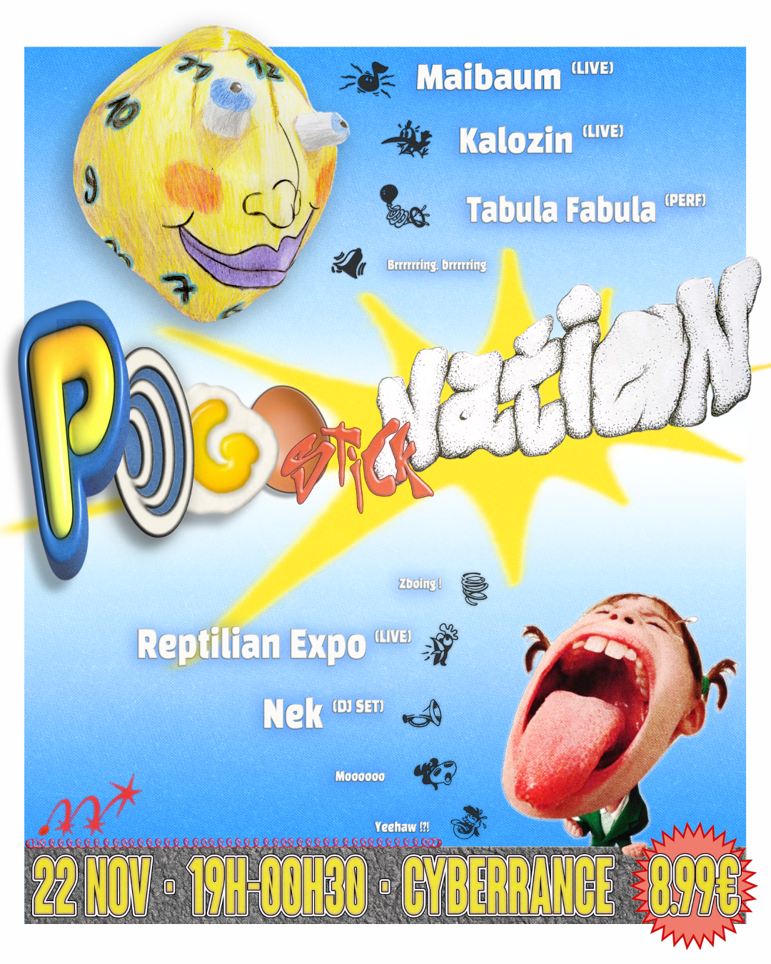 ༄ Entendez-vous ce bruit qui résonne à travers la ville ?҉z҉b҉o҉i҉n҉g҉ ҉z҉b҉o҉i҉n҉g҉ ҉Z҉B҉O҉I҉N҉G҉ Oui, c’est bien ce que vous croyez Un grand bâton armé de ressorts et surmonté d’un guidon auquel tentent désespérément de s’accrocher une troupe de musicien.ne.s, deejayz et performeureuses en route pour le grand meeting international du rebondissement, j’ai nommé : 𝑷𝑶𝑮𝑶 𝑺𝑻𝑰𝑪𝑲 𝑵𝑨𝑻𝑰𝑶𝑵 ☁ Arrivée prévue le samedi 22 novembre à la Cyberance, avec en guest starz, une line-up top of ze zboing : 𓂃 MAIBAUM (live) Déambulation dans un paysage sonore multicolore à la végétation dense, peuplé d’espèces de plantes enchantées jusqu’alors inconnues au bataillon qui poussent là par je ne sais quelle sorcellerie. @echotope 𓂃𓂃TABULA FABULA (perf) Comme une fable fantastique mais IRL, où deux collectioneureuses de sorts, de contes et de reliques anciennes vous invitent à un petit drift temporel et dimensionnel par la pensée magique. @tabula_fabula 𓂃𓂃𓂃KALOZIN (live) Avez-vous déjà vu des wiimotes enclencher un tumulte de percussions brésiliennes qui s'enchevêtrent harmonieusement pour former une brega funk hallucinée ? Maintenant oui. @kalozin__ 𓂃𓂃𓂃𓂃REPTILIAN EXPO (live) Un nuage de bubulles avec des ptits lézards qui gigotent dedans, pris dans une grand bourrasque de vent, pour danser oisivement en laissant son corps porté par l'inertie, le tout dans un chaos à la fois visqueux et récréatif. @reptib1 𓂃𓂃𓂃𓂃𓂃NEK (dj set) Un grand dédale où vous croiserez le vrombissement des basses avoir une conversation un peu deep avec des mélodies hypnotiques qui elles mêmes rigolent avec des polyrythmie dont on ne sait pas trop si elles sont méga rapidos ou supra ralentatos. @nek_mdk Pogo Stick Nation est une proposition de @briwa_ @ynhame_lefrit et de @nathan_rusticwidow, scénographiée par @oundene @pruneboudgourd @gervais.elsa et @cemmawatt, avec l’aimable prêt de pièces de @valentine_gardiennet, et sonorisé par le Star System, piloté par @orianarrachart . Rendez vous le 22 novembre de 19h à 00h30 la Cyberrance, 93 Rue de la Liberté, 93230 Romainville. Tickets disponibles sur Helloasso lien en bio + adhésion à l'entrée ! Visuel Briwa & LeFrit Adress: Cyberrance93 rue de la Liberté Romainville ![]() |