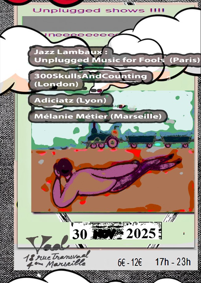 | 30.11.2025 | 17:00 | Marseille | UNPLUGGED SHOWS !!! Jazz Lambaux + 300SkullsAndCounting + Adiciatz + Mélanie MétierDiscription: