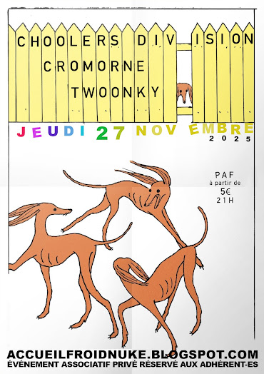 CHOOLERS DIVISION Nuclear fusion of abstract hip hop and powerful DIY electro. Un projet belge, révélé à Marseille par le milieu underground de La Friche de la Belle de Mai et de l’EMBOBINEUSE. Depuis 2013, ils se sont produits un peu partout en Europe. Une prestation particulièrement remarquée à la GAÎTÉ LYRIQUE à Paris en décembre 2015 a retenu l’attention de David LEMOINE (CHEVEU) qui promotionne désormais la DIVISION. Choolers Division propose un hip hop électro, tordu et incandescent avec toute une multitude de niveaux sonores captivants et décalés. Une sorte de machine déjantée, hors de contrôle, produisant un mélange étourdissant de genres musicaux. Le langage énigmatique de Kostia Botkine et Philippe Marien oscille entre complaintes affutées et rugissements survoltés. Sur scène, l’ambiance est en mode survoltage, pas de place pour l’économie ou l’autocensure. A chaque fois réinventées en live, les compositions brutes d’Antoine Boulangé et Jean-Camille Charles sont ajustées aux personnalités des deux rappeurs. https://thechoolers.org/ https://www.cartoncartoncarton.com/choolers-division ✦ CROMORNE Trio vielle à roue, synthés, drum machines et batterie. Issu du terreau artistique entretenu par le collectif de musiciens dijonnais L’Engeance, le projet Cromorne naît en 2018, imaginé par Nicolas Virey, vielleux en apprentissage et Kévin Valentin, batteur et adepte des synthétiseurs, complété depuis peu par Hugo Parisot et ses machines rythmiques. Le trio propose une musique à bourdons, répétitive et entêtante, immersive et bruitiste en filiation avec les musiques électroniques et contemporaines d’une part, et les musiques anciennes et traditionnelles d’autre part. L'idée fondatrice du projet étant de rapprocher des instruments et des textures sonores très différentes et expérimenter grâce à ce mariage les phénomènes de transe auditive. La vielle à roue amplifiée développe son propos en s'appuyant sur une trame de fond créée par la batterie, les machines et les synthétiseurs. Tous ces éléments rythmiques et harmoniques soigneusement sélectionnés et imbriqués fusionnent pour tenter d'emmener l'auditoire dans un voyage sonore méditatif. L'humain côtoie la machine dans un duel tendu où acoustique et électronique s'opposent et s'attirent. Deuxième venue pour Cromorne, qui était venu jouer à l'AF en mai 2014. https://lengeance.bandcamp.com/.../d-ploration-sur-la... https://youtu.be/5nUW4Bfms0I?si=JpAmbs8GkBMmcQPT ✦ TWOONKY Macadam Mambo/Spettro/villa recordings. Surrealism/ cosmic/dirtyfunky. Le duo de frères italiens Michele et Simone Bornati, à l'origine du club Spettro à Brescia, mènent le projet Twoonky depuis 2015. Leur musique mêle boîtes à rythmes vintage, sonorités acoustiques, océans de bruit instables, synthétiseurs hypnotiques, saxophones distordus, collages expérimentaux et une pensée pétillante, le tout structuré autour d'une musique industrielle post-punk, puisant dans les extravagances de la no wave, du krautrock et des excentricités de la culture électronique contemporaine. Ils ont sorti plusieurs albums sur Villa Recordings (label brescien lié au club Spettro), dont les LP « DEZZO » et « OTTICO » chez Macadam Mambo, et ont figuré sur de nombreuses compilations de la scène club expérimentale européenne. Deuxième venue pour Simone, qui était venu jouer à l'AF en mai dernier, avec le duo Sax Tape. https://twoonky.bandcamp.com/ https://macadammambo.bandcamp.com/.../mmlpxx606-twoonky... https://www.youtube.com/watch?v=NqIQ11u4BAc https://www.youtube.com/@MsTwomonkeys Artwork original : Anna Haifisch https://www.hai-life.com/ https://www.instagram.com/anna.haifisch/?hl=fr Portes 20h30, premier concert à 21h P.A.F. à partir de 5€ pour les artistes Évenement associatif privé réservé aux adhérent-es. Adhésion possible les soirs d'événements (2€ sept. 2025 à sept. 2026). L'Accueil Froid est un lieu safe, merci de votre bienveillance envers les personnes présentes et le lieu. Adress: Accueil Froid Nuke21 rue Sully Amiens ![]() |