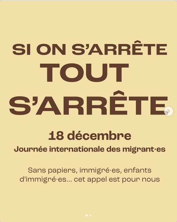 🛑 UNE JOURNÉE SANS NOUS 🛑📅 mobilisons nous demain 18 décembre ✊ Le 18 décembre, on s’arrête. Parce que si on s’arrête, tout s’arrête. Immigré·es, personnes racisées, sans-papiers, enfants de l’immigration : 👉 cette journée est la nôtre 👉 notre travail vaut des droits 👉 nos vies valent mieux que le mépris 📍 Rejoins la mobilisation avec le @marchedessolidarites Sans nous, rien ne tient. Avec nous, tout change. ![]() |