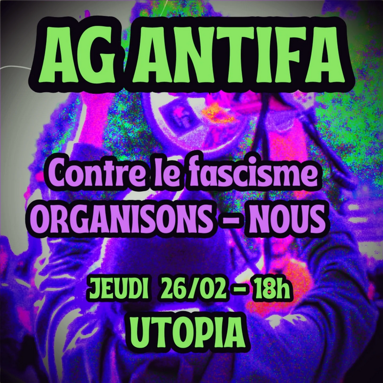 Contre le fascisme, organisons nous !AG Antifa le jeudi 26 février à 18h au cinéma Utopia L'idée est de proposer un espace d'auto-organisation horizontal, face aux offensives d'extrême droite et à la répression croissante, notamment depuis la mort de Quentin Deranque. Accès au lieu (5 place Camille Julian) via le tram A et F, arrêt St Catherine. Masques FFP2 pour la réduction des risques aéroportée (Covid 19 entre autre) disponibles sur place. Adress: Utopia5 place Camille Julian Bordeaux ![]() |