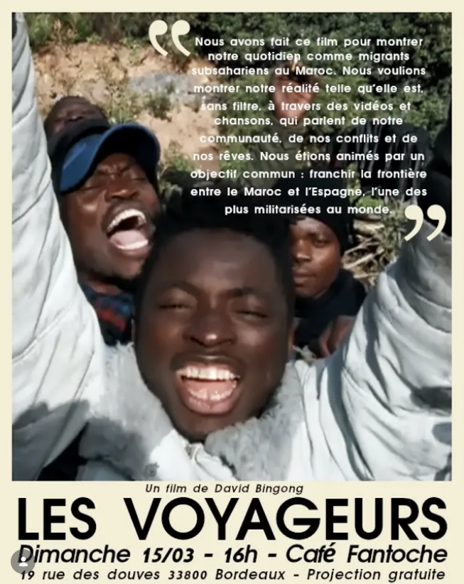 📽️Projection de Les Voyageurs de David Bingong, dimanche 15 mars à 16h au Café Fantoche. Espagnol, sous titre français. Gratuit."Nous avons réalisé « Les Voyageurs » pour partager notre quotidien de migrants subsahariens au Maroc, en nous concentrant sur les petites choses de la vie. Nous souhaitions montrer notre réalité telle qu'elle est, sans filtre, à travers quelques chansons et vidéos créées au fil du temps, qui évoquent notre communauté, les conflits et nos rêves. Nous étions animés par un objectif commun : franchir la frontière entre le Maroc et l'Espagne, l'une des plus militarisées au monde. Ce film, tourné par étapes entre 2014 et 2015, a non seulement permis de saisir cette réalité, mais aussi de nous donner de la force en tant que groupe, de nous donner plus de force." Adress: Café Fantoche19 rue des Douves Bordeaux ![]() |