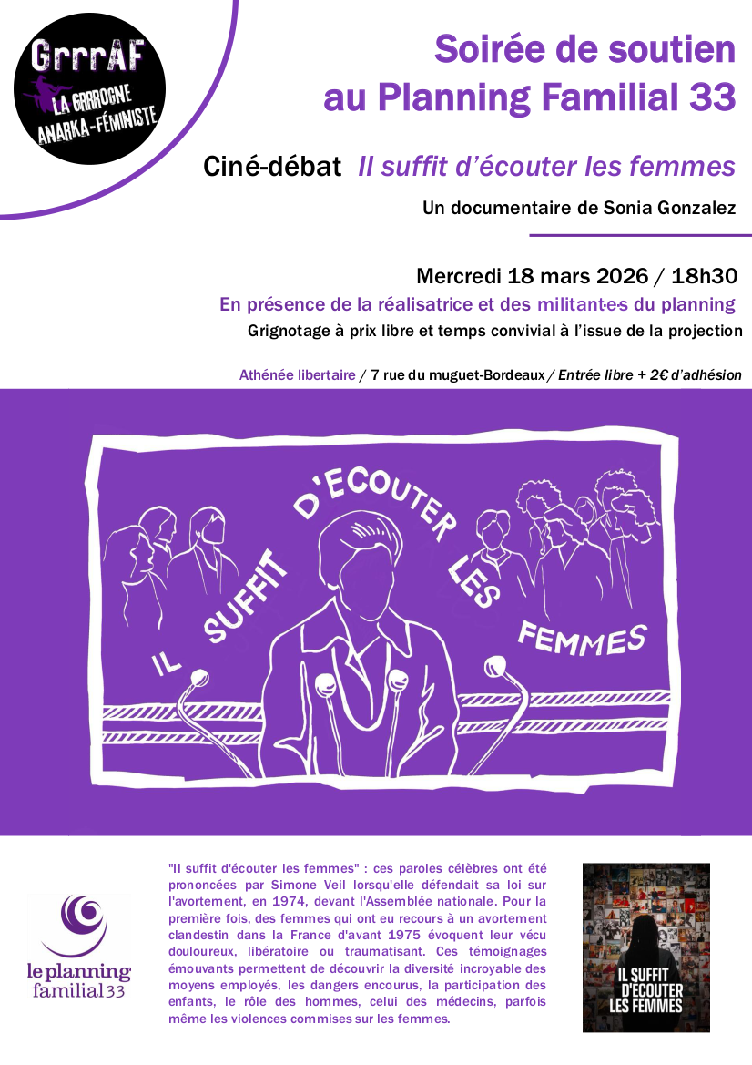 | 18.03.2026 | 18:30 | Bordeaux | 📹 Ciné-débat : « Il suffit d’écouter les femmes » |