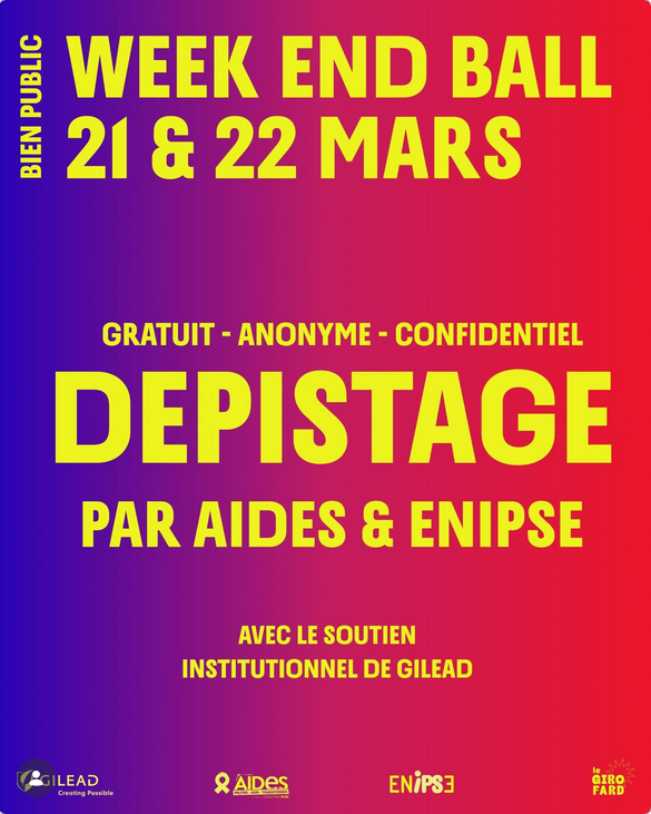 DÉPISTAGE GRATUIT, ANONYME & CONFIDENTIELPendant tout le week-end Ball ✨ À l’occasion du NEON BALL et de WOUBILAND, nous nous associons à AIDES et ENIPSE pour proposer des dépistages TROD (VIH, hépatites, IST) sur place. 📅 Samedi 21 & dimanche 22 mars 📍 À Bien Public, Bordeaux Venez rencontrer leurs équipes, échanger sans tabou et prendre soin de vous, à votre rythme, en toute discrétion. Connaître son statut, c’est pouvoir en prendre soin. I = I. Vivre avec le VIH n’est pas une anomalie. Avec le soutien institutionnel de Gilead Un dispositif porté par @legirofard Adress: Bien PublicBordeaux ![]() |